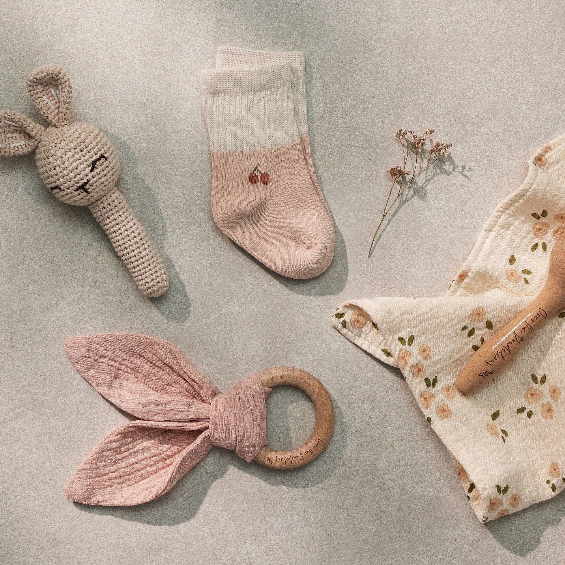 These adorable organic cotton socks will keep little feet warm. In a gorgeous soft blush pink adorned with cherries. Set includes two pairs.