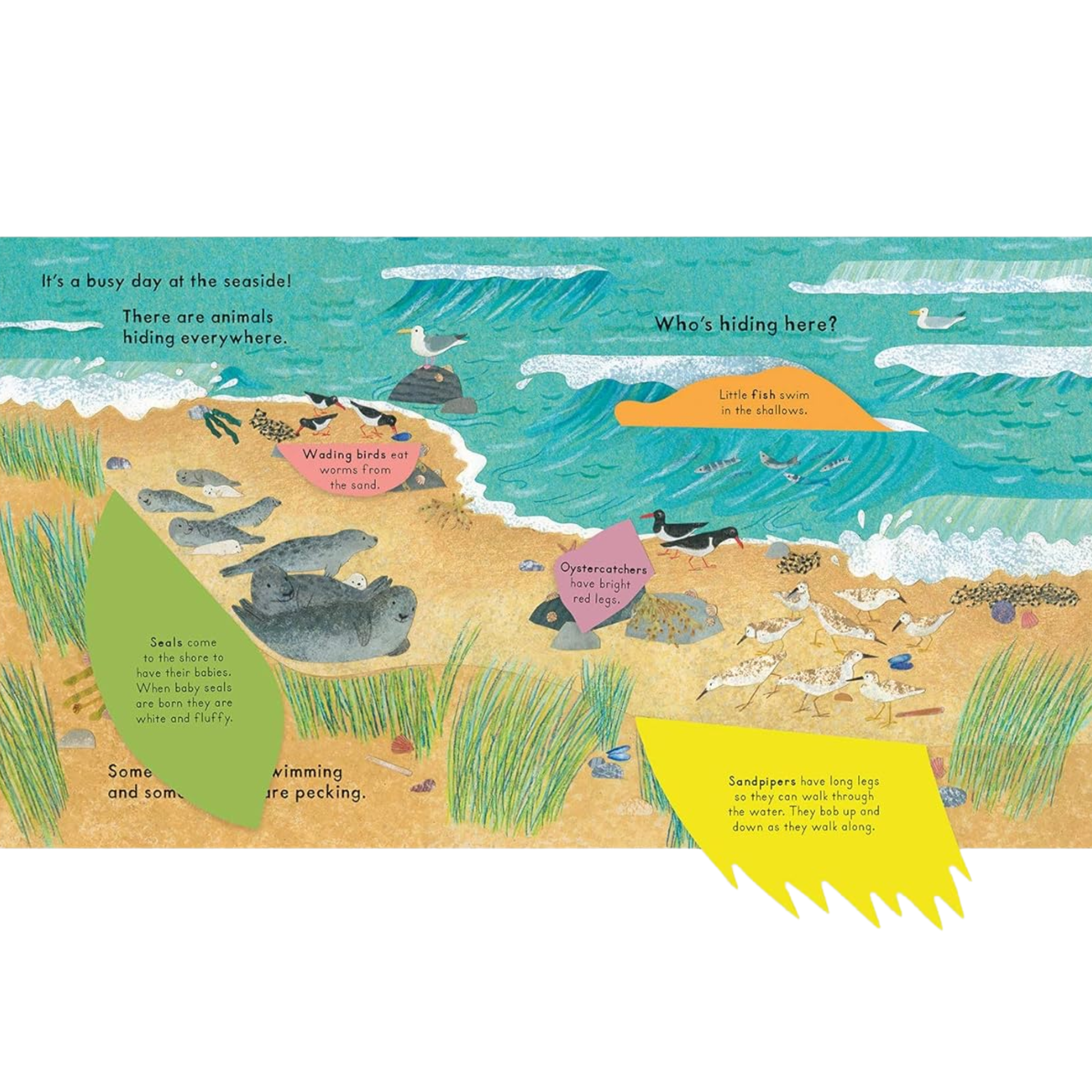 Explore the many creatures that live by the seaside and discover where they are hiding and what they’re doing. This creative lift-the-flap book allows young children to examine colourful collage pages, lifting flaps beneath rocks, shells, and seaweed to learn fascinating facts about coastal wildlife. It offers a gentle and engaging introduction to the natural world by the sea.