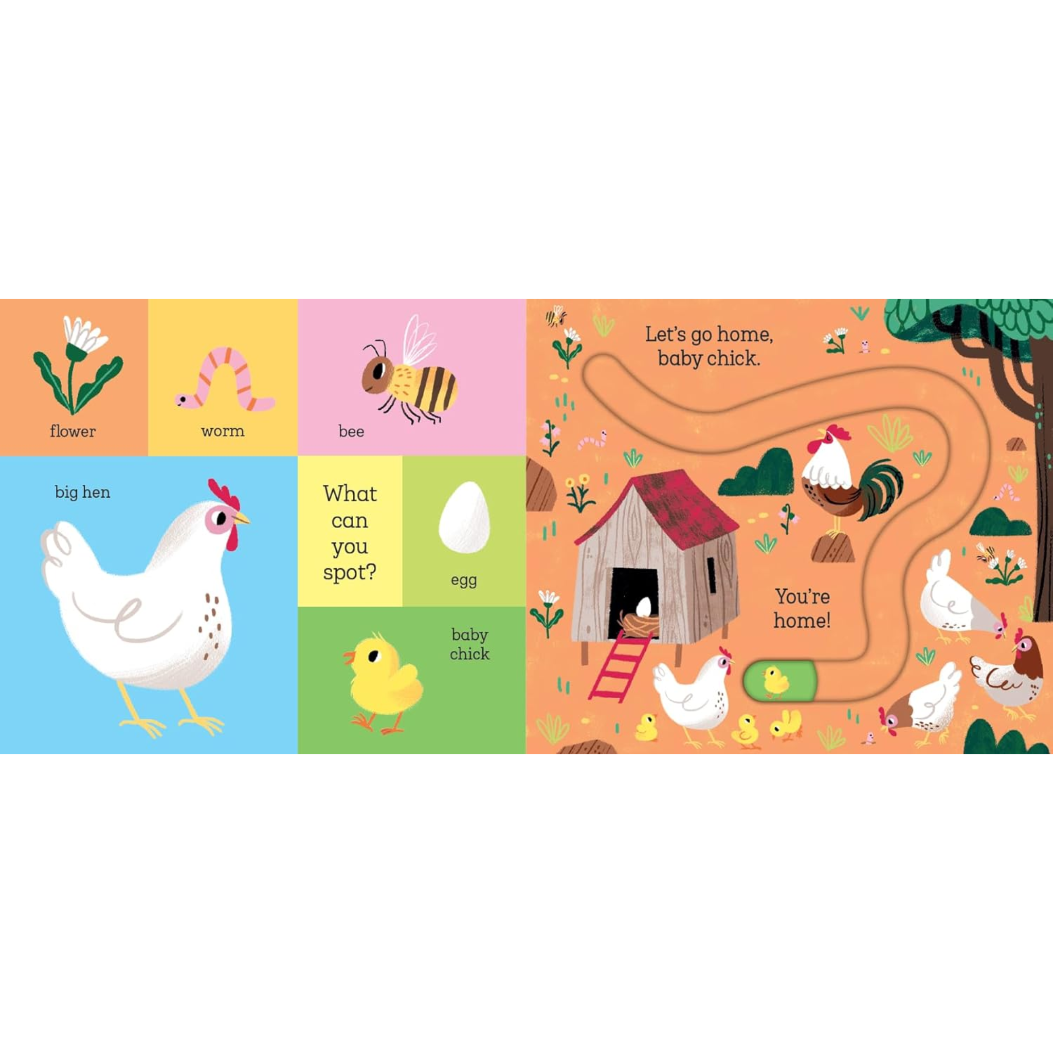 Join four lovable baby animals, a chick, lamb, duckling, and calf, as they find their way back home in this engaging sliding counter book! Designed with simple moving parts and four distinct tracks, it helps little ones build hand-eye coordination and focus. Crafted from sturdy board, this book offers a rewarding experience for babies and toddlers. Plus, use the Stories Aloud QR code on the back cover to listen along to the story.