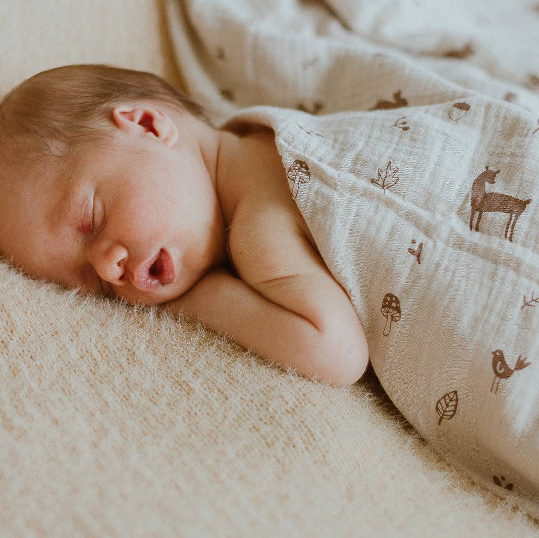 The much-loved soft and crinkly muslin has a new look! A whimsical woodlands print with bunnies, deer and mushrooms. Over The Dandelions' swaddles are made from GOTS certified organic cotton. They are as soft as a cloud and perfect for wrapping baby in, as muslin is lightweight and warm. A wonderfully versatile baby item - use for swaddling, nursing, a burp cloth, a bassinet sheet and much more!