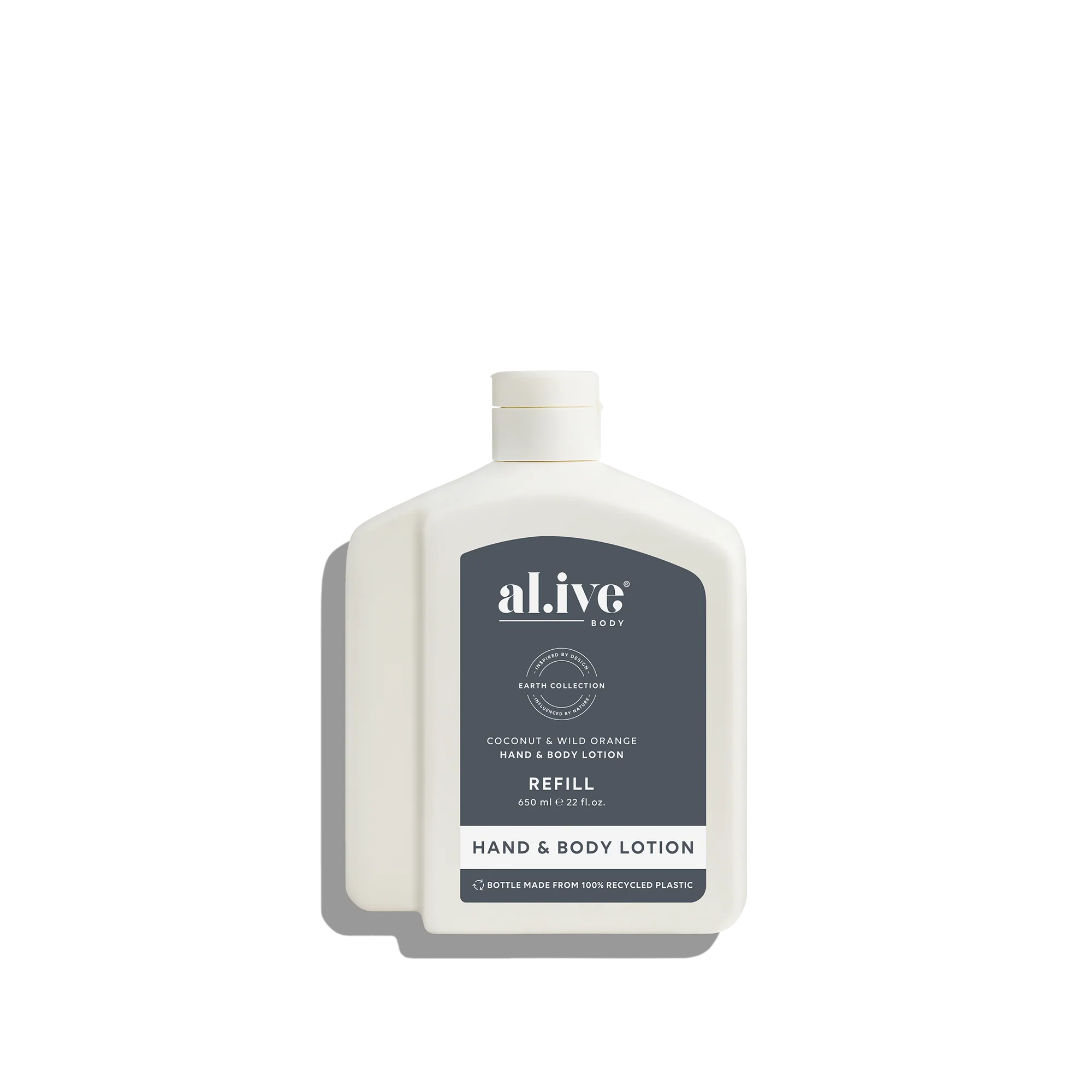 Refill your Coconut & Wild Orange Lotion bottle with the 650 ml Lotion Refill. This sustainable refill solution is designed to reduce waste and offer a practical, eco-friendly way to top up your favourite al.ive body essential.
