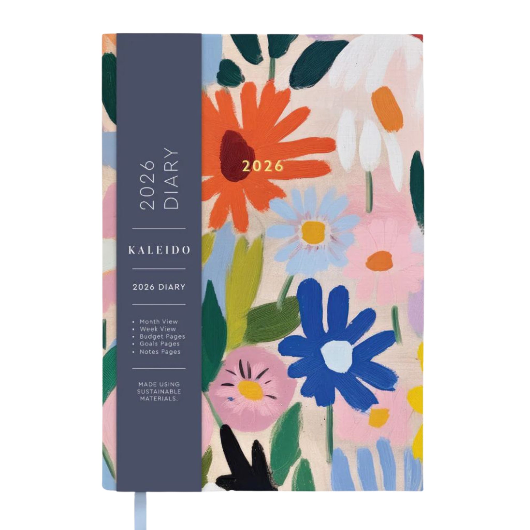 This A5 2026 diary features a semi-flexible cover with linen mounted on 2mm greyboard, highlighted by elegant gold foil lettering. It offers a week-to-a-double-page layout, along with a yearly overview, monthly planner, pages for key monthly notes, and budget tracking. Each month showcases a unique patterned background throughout the diary. Additional sections include 20 lined pages for notes and 15 pages for to-do lists. A colour-matched satin ribbon helps you keep your place, and all pages are made from sustainably sourced paper, supporting your eco-friendly planning.