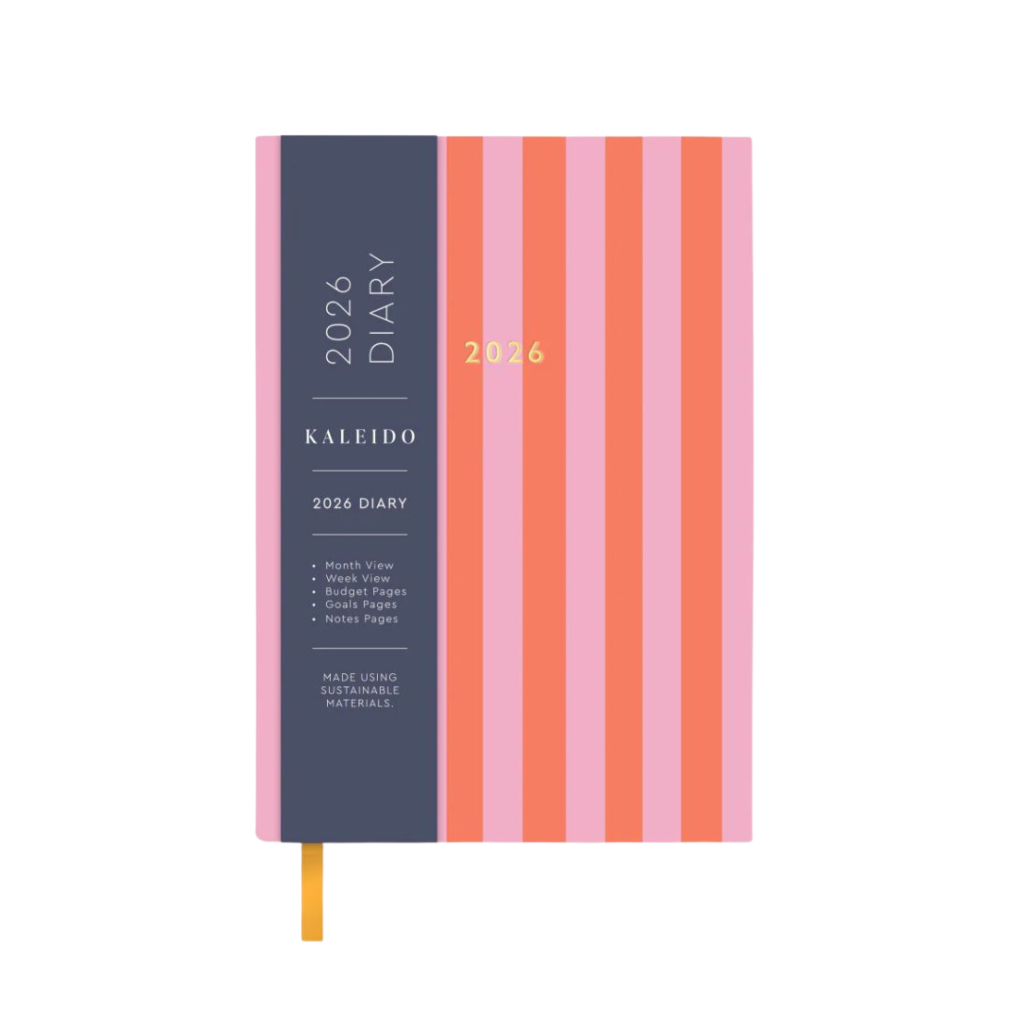 This A5 2026 diary features a semi-flexible cover with linen mounted on 2mm greyboard, highlighted by elegant gold foil lettering. It offers a week-to-a-double-page layout, along with a yearly overview, monthly planner, pages for key monthly notes, and budget tracking. Each month showcases a unique patterned background throughout the diary. Additional sections include 20 lined pages for notes and 15 pages for to-do lists. A colour-matched satin ribbon helps you keep your place, and all pages are made from sustainably sourced paper, supporting your eco-friendly planning.