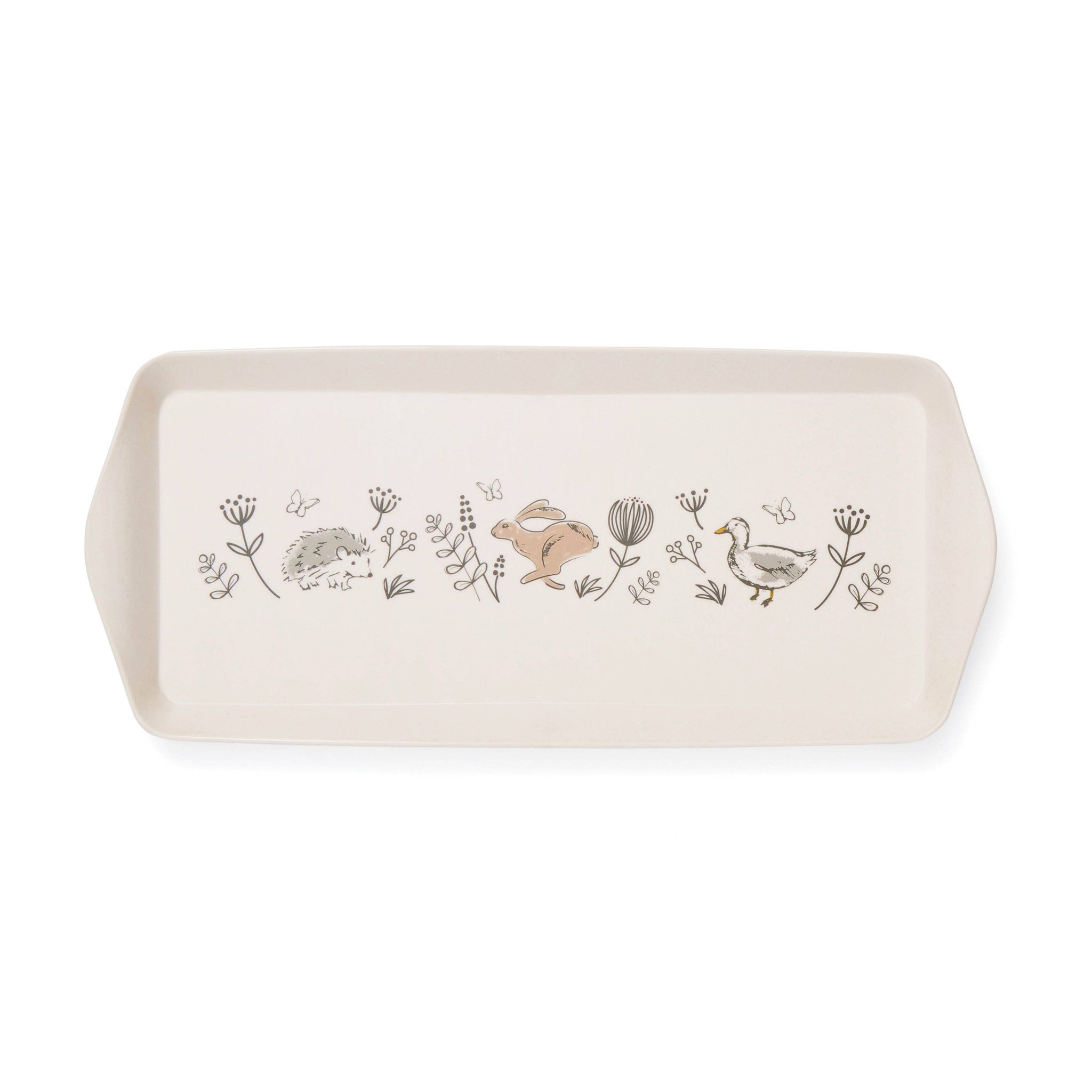 A lovely countryside design featuring charming hedgehogs, adorable waddling ducks, hares and the occasional cockerel on a natural ground.