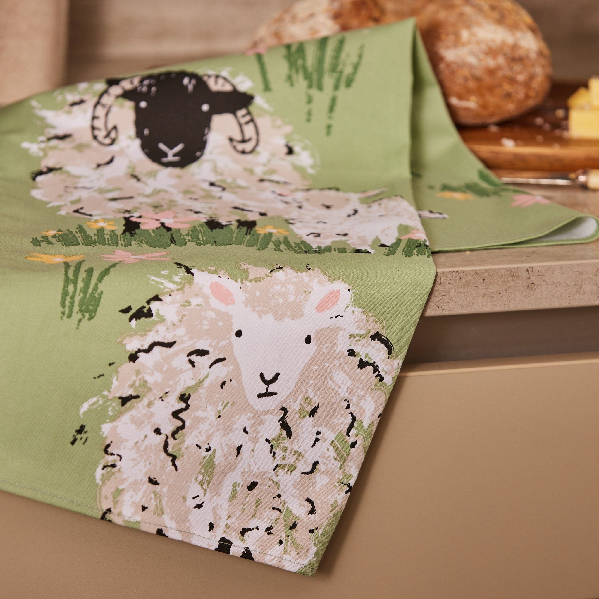 This Woolly Sheep Cotton Tea Towel adds a touch of countryside warmth to your kitchen, perfect for daily use or when hosting loved ones. It showcases hand-drawn sheep and their newborn lambs resting in a flowery meadow. The soft curls of their fleece and charming expressions make it a delightful kitchen essential for fans of farm life. Highly absorbent, it quickly dries dishes, mugs, and surfaces, then doubles as a lovely decorative piece when hung up.
