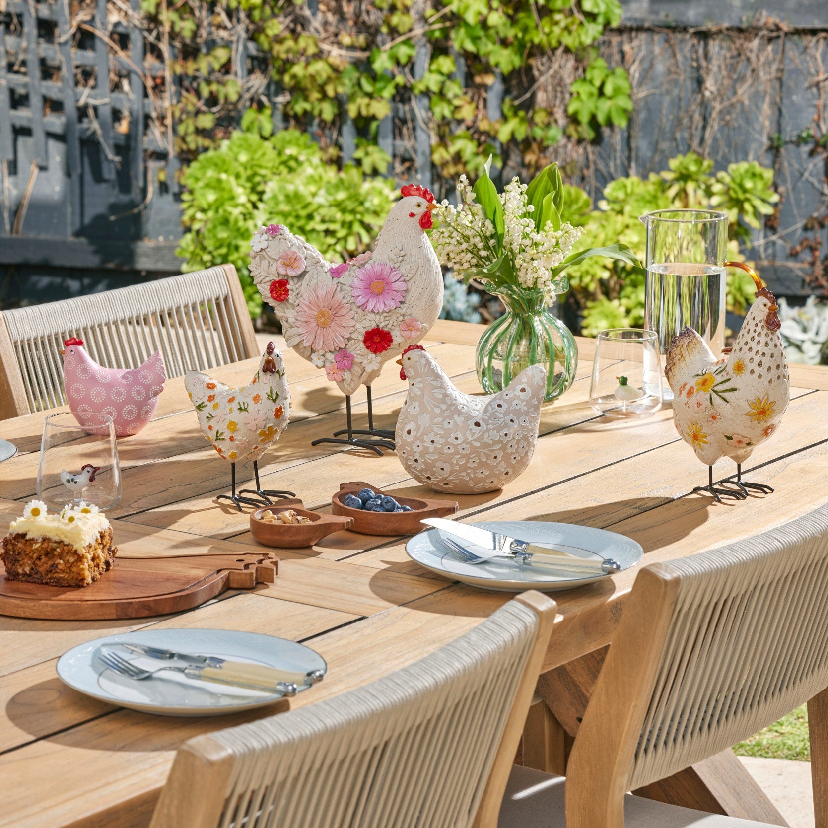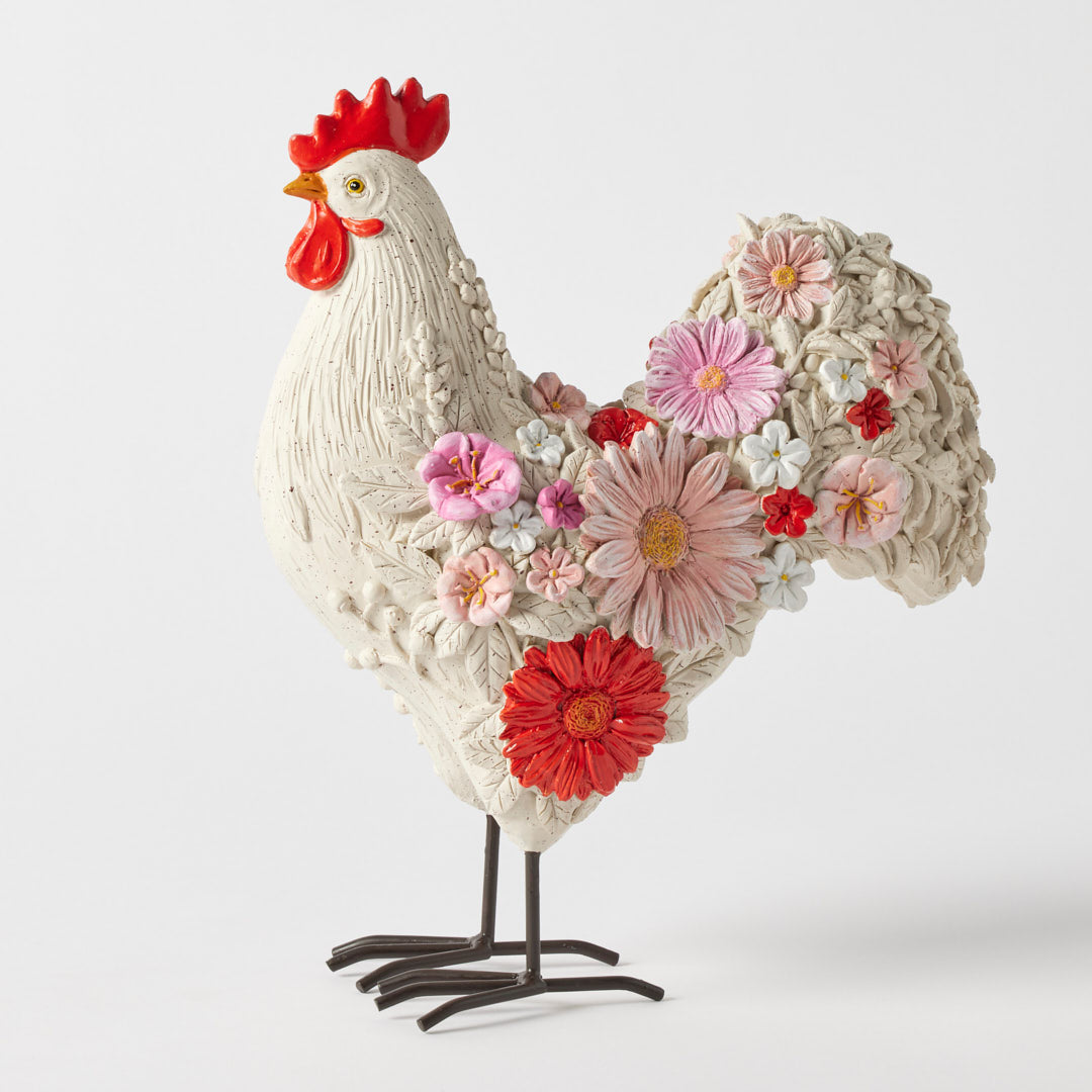 Meet Cher, a striking statement sculpture that redefines farmhouse charm with an artful, contemporary twist. Crafted from resin with refined metal legs, Cher is adorned with intricately sculpted florals in shades of blush, rose, and crimson, creating a captivating contrast against her softly textured ivory feathers.