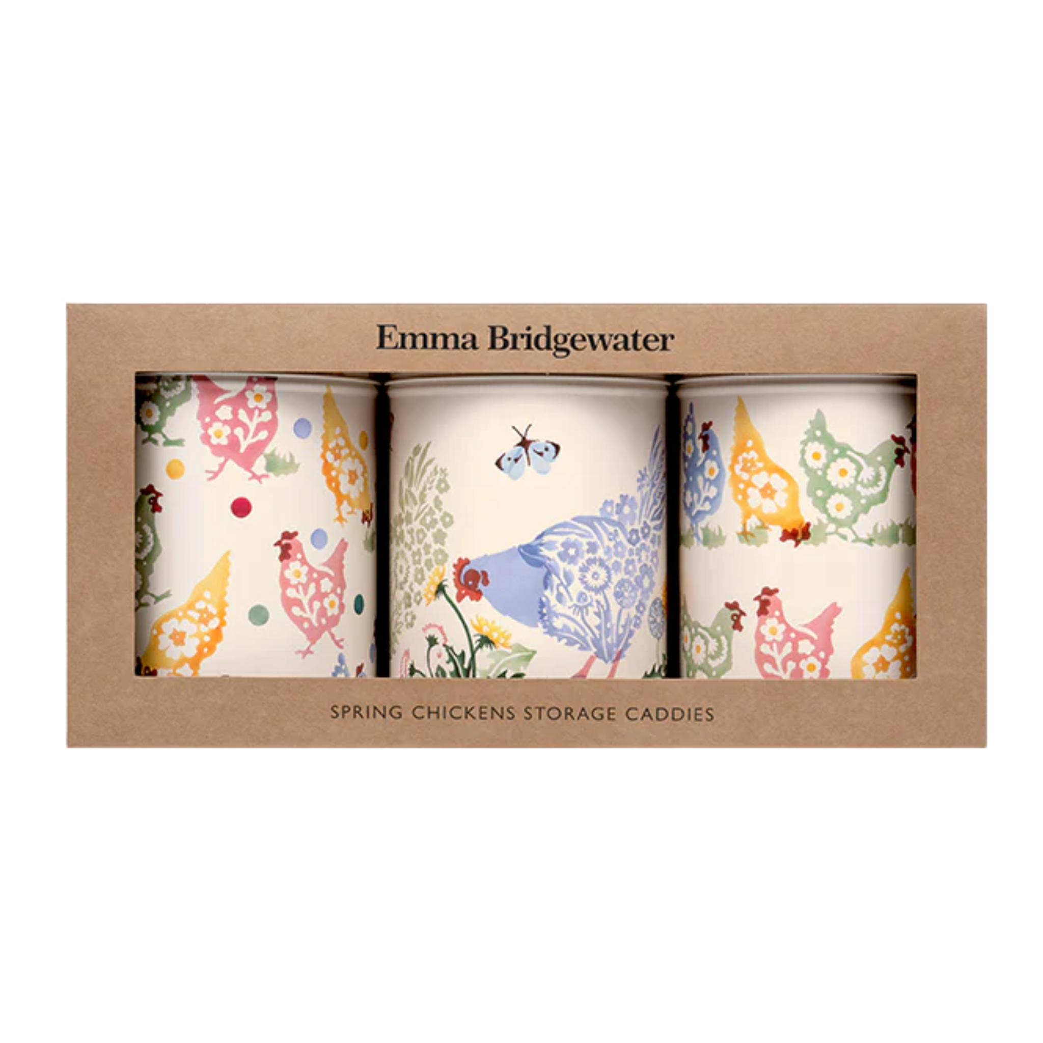 Keep your kitchen organised in style with this charming trio of round canisters featuring a vibrant spring chicken design. Perfect for storing tea, coffee, sugar, or your favourite dry goods, these Emma Bridgewater pieces bring a touch of farmhouse beauty to your countertop. Each canister is thoughtfully crafted to complement your home while keeping essentials within easy reach. A delightful addition to any kitchen that celebrates both function and design.