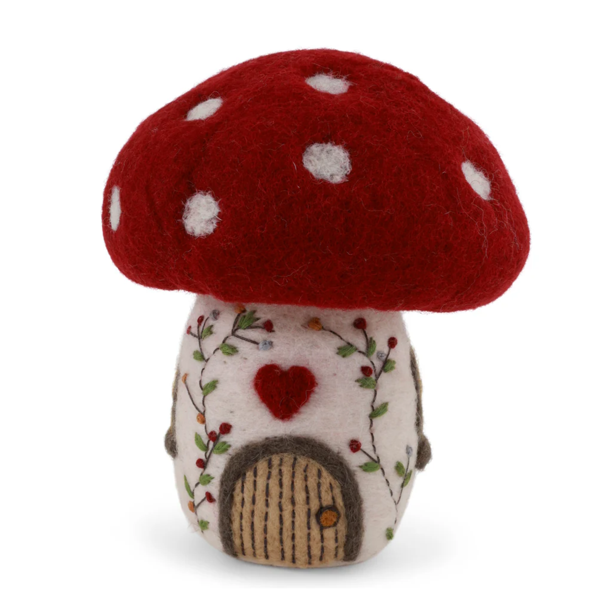 Transform your space with this thoughtfully crafted felt mushroom house, a Danish design brought to life by skilled artisans in Nepal. Constructed from luxurious 100% New Zealand wool, it showcases a striking red-spotted mushroom top, soft cream foundation, and intricate hand-embroidered botanical accents complete with a charming felt doorway and window, straight out of a fairytale. Made with integrity under fair trade practices, each piece is wonderfully one-of-a-kind, adding authentic Nordic warmth and whimsy to your decor.