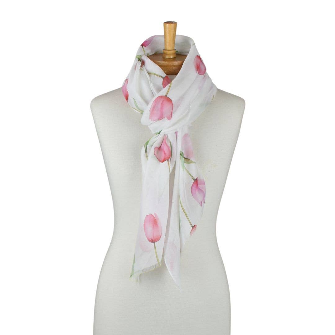 Infuse your look with soft elegance and floral charm with the Blooming Tulips Scarf in Pink. Inspired by a spring garden in full bloom, this scarf features delicate tulip motifs in shades of pink and fresh green; a nod to the season’s natural beauty.