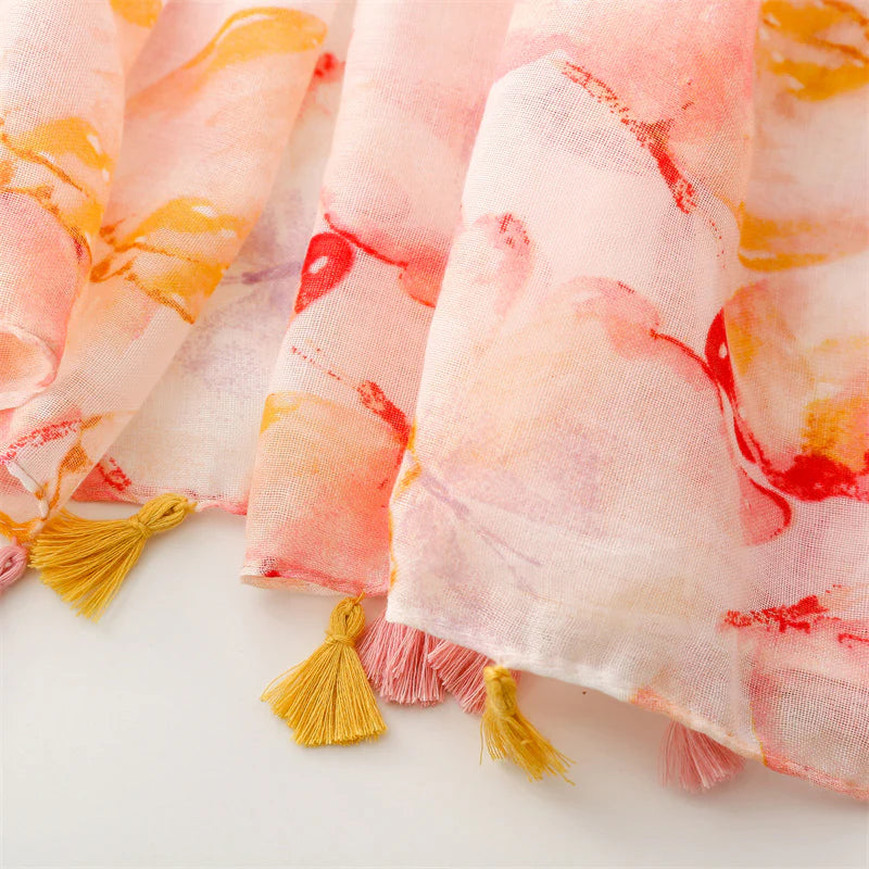 This beautiful Pink Watercolour Butterfly Scarf is a must-have for your wardrobe! Made with soft and comfortable polyester and adorned with lovely tassels, this accessory is perfect for effortlessly elevating your style.