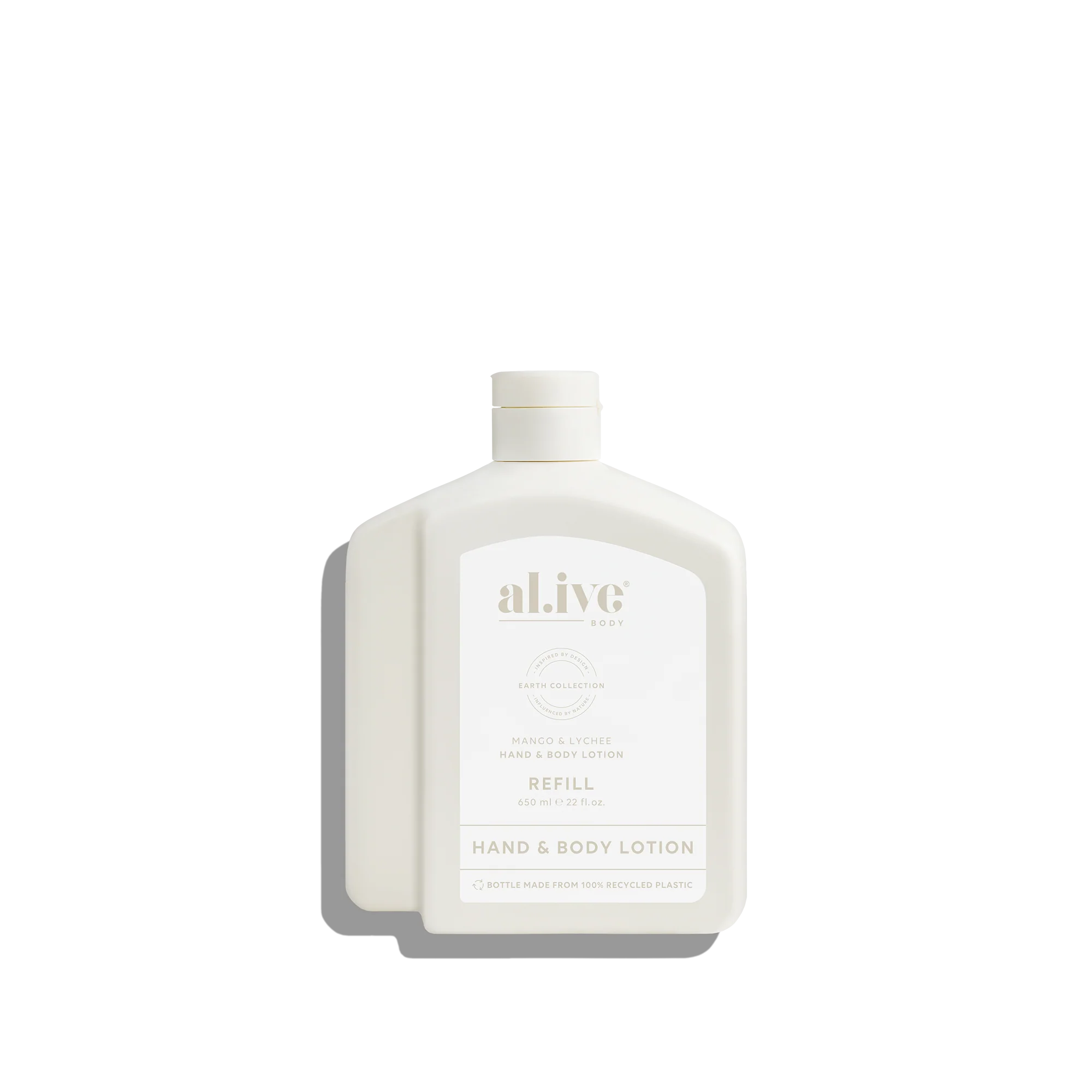 Refill your Mango & Lychee Lotion bottle with the 650 ml Lotion Refill. This sustainable refill solution is designed to reduce waste and offer a practical, eco-friendly way to top up your favourite al.ive body essential.