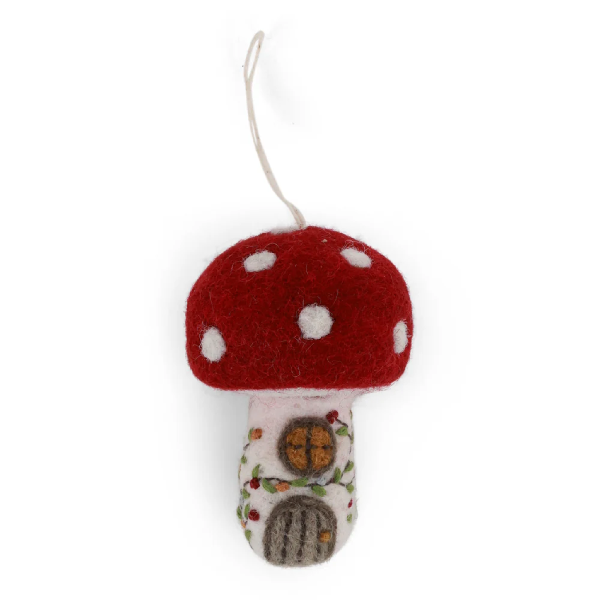 Bring a touch of Nordic charm into your home with this delightful handcrafted felt mushroom house. Lovingly made in Nepal from premium New Zealand wool, this whimsical decoration features a red-spotted cap paired with a cream body adorned with hand-embroidered botanical details and a sweet little felt doorway and window, straight out of a fairytale. Each piece is individually created under fair trade practices, making it a thoughtful choice that celebrates artisanal craftsmanship.