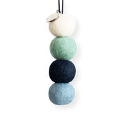 - 4 unscented ethically sourced wool felt balls with branded charm and elastic string for easy hanging