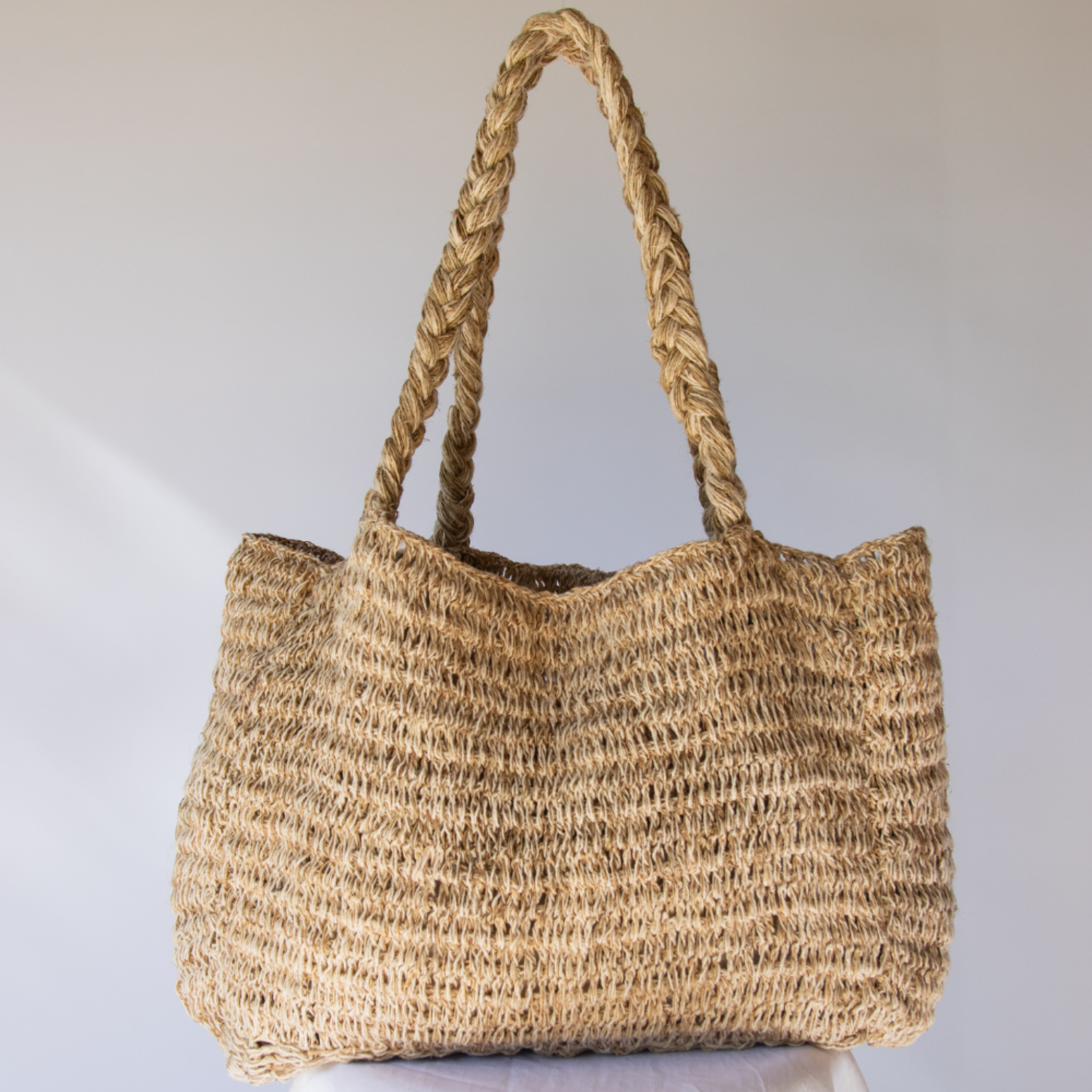 This oversized bag is handwoven in Nepal from a durable hemp and cotton blend. It features chunky plaited shoulder straps for added comfort and is roomy enough for market mornings, beach days, and everything in between.