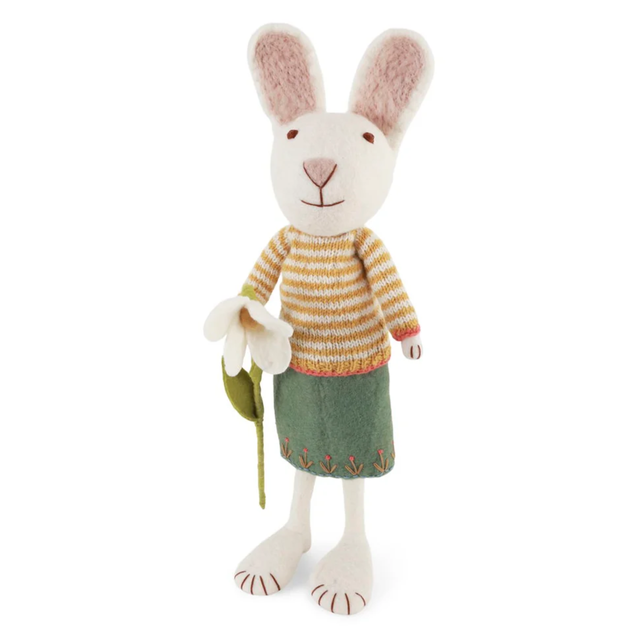 The Gry & Sif Bunny Girl Skirt & Snowdrop Extra Large is a stunning handcrafted piece that celebrates Scandinavian simplicity and charm. Made in Nepal from 100% New Zealand wool, this elegant felt bunny wears a mustard and cream knitted jumper with a green embroidered skirt and holds a delicate felt snowdrop flower. Each piece is carefully handmade under fair trade conditions, ensuring every bunny has its own unique personality.